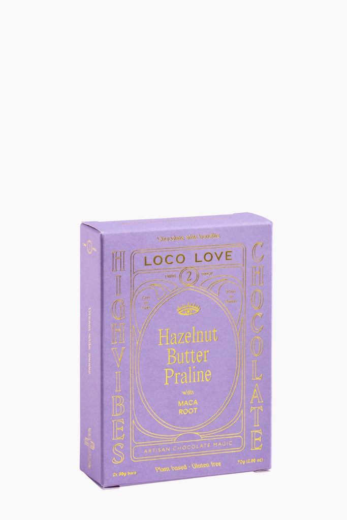 hazelnuts (25.6%)*, cacao paste*, coconut blossom sugar*, cacao butter*, gelatinised maca root powder* (2%), probiotic (Bacillus coagulans), Australian sea salt, Cacao solids 45.5%