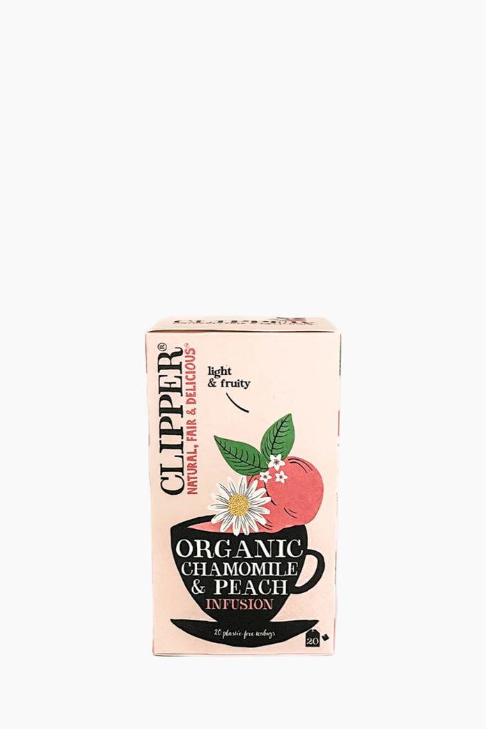 • Take a moment for yourself to savor this delicious, lightly sweetened Clipper Chamomile And Peach Infusion. This fresh blend of chamomile, peach, orange and rose, you imagine yourself in a field of flowers.