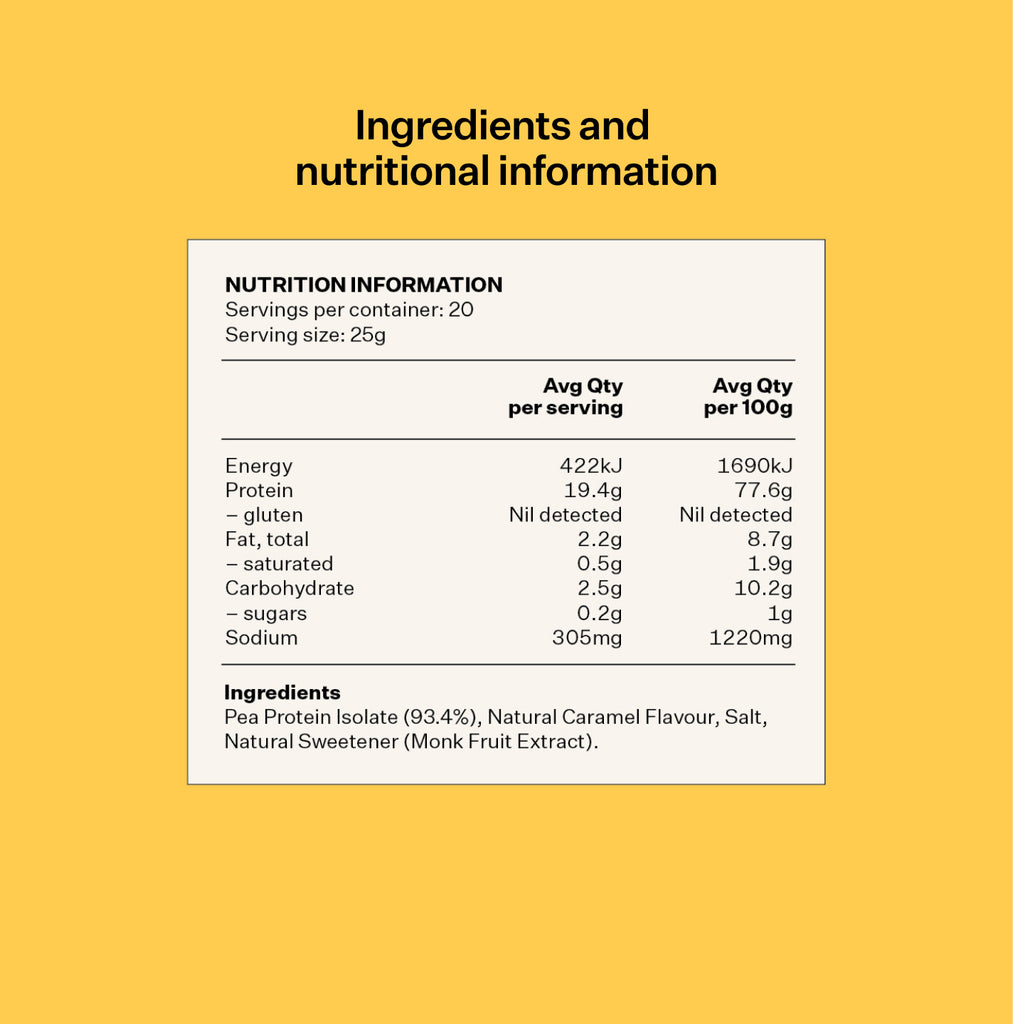 • Providing you with a burst of clean energy, Two Islands Salted Caramel Pea Protein Powder is made with just 4 ingredients - containing natural caramel flavour and perfectly balanced with a sprinkle of salt. With over 19g of protein per serve you can count on this flavour to satisfy and fuel your body.