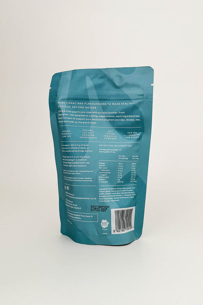 Prebiotics (Inulin from Chicory Root), New Zealand Lemon Powder (24%), (Blue Spirulina Extract), Butterfly Pea Flower Powder, L-Theanine, Food Acid (Citric Acid), Natural Sweeteners (Monk Fruit Extract, Thaumatin).