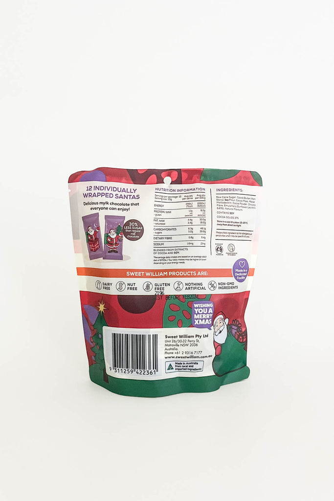 The original, classic Sweet William mylk chocolate, smooth and chocolatey, poured into the shape of a mini Santa! Each Santa Multipack contains 12 individually wrapped Santa chocolates.